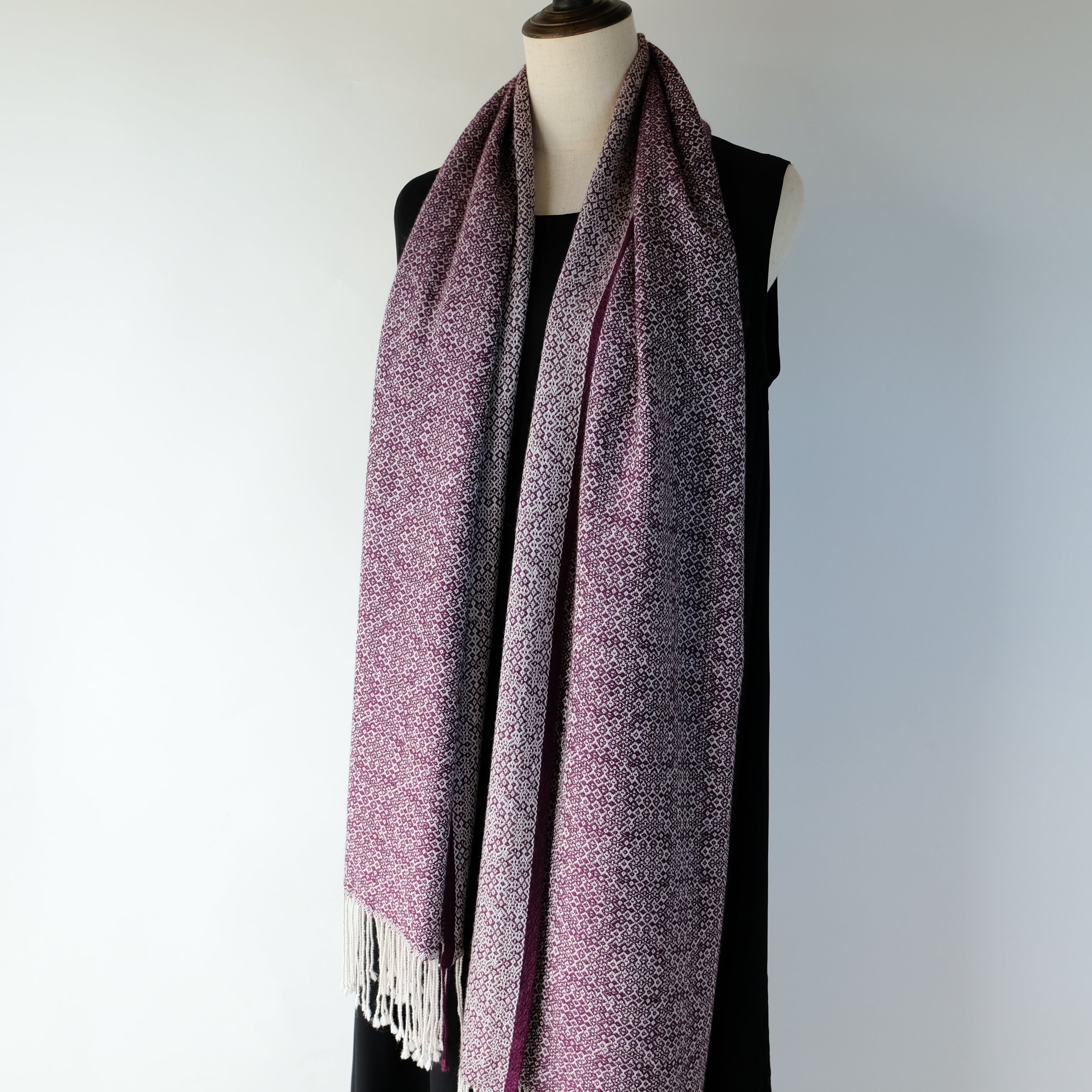 やわらかなアイボリーを経糸に、深みのあるマルベリー(桑の実色)を緯糸に、細やかで複雑な柄を織り出しました。陽光では赤みが増し、白灯では紫みが増します。日本の伝統色では葡萄色に近いとても綺麗な色合いです。表と裏で織柄と色の出方が変わるので、纏い方でいろいろな表情を楽しんでいただけます。ふっくら柔らかくとても温かいので、春や秋はトップスやコートの代わりに、冬には首元に小さく巻いてマフラーのような纏い方がおすすめです。シルク混なので上品な光沢と華やかさがあり、フォーマルな場にもお使いいただけます。