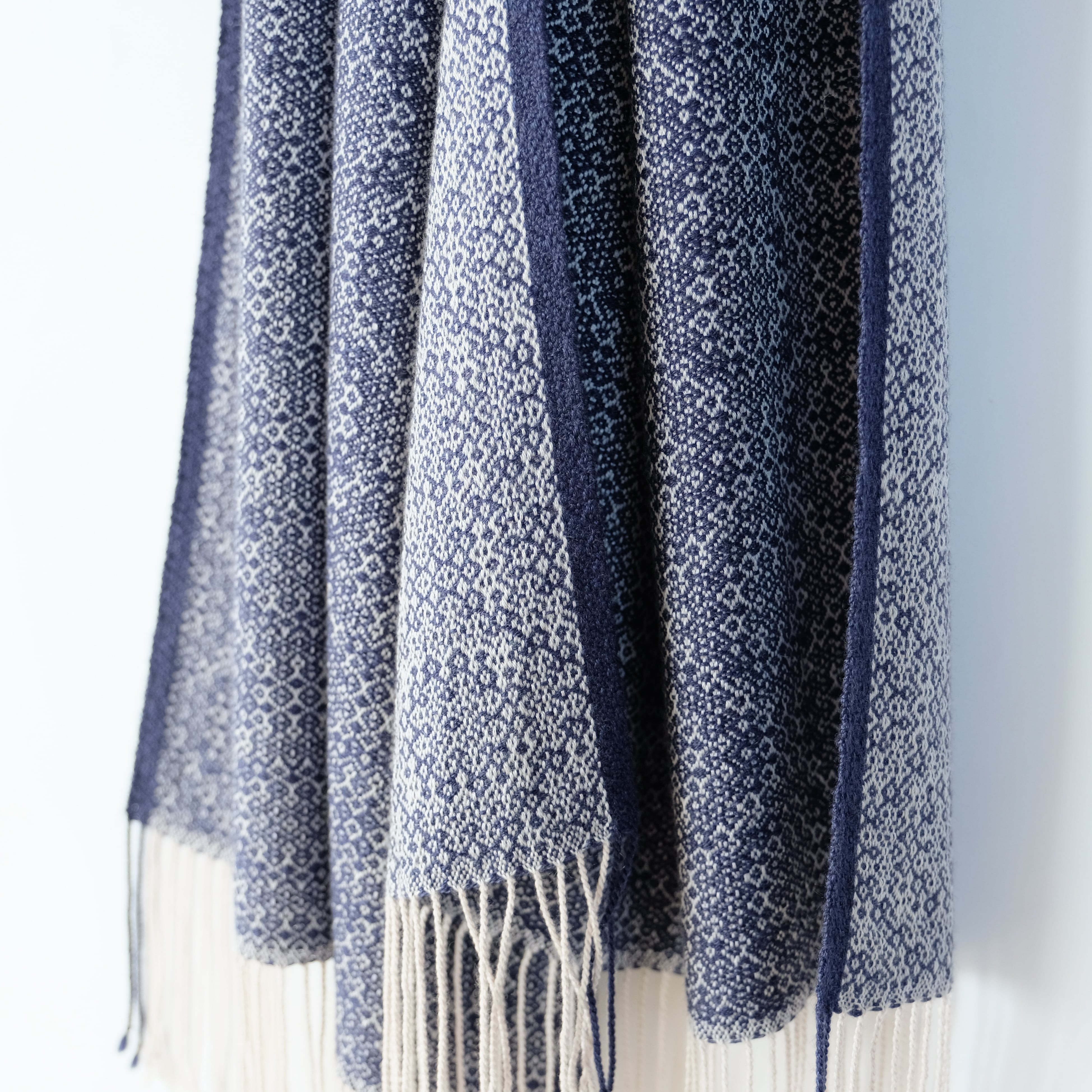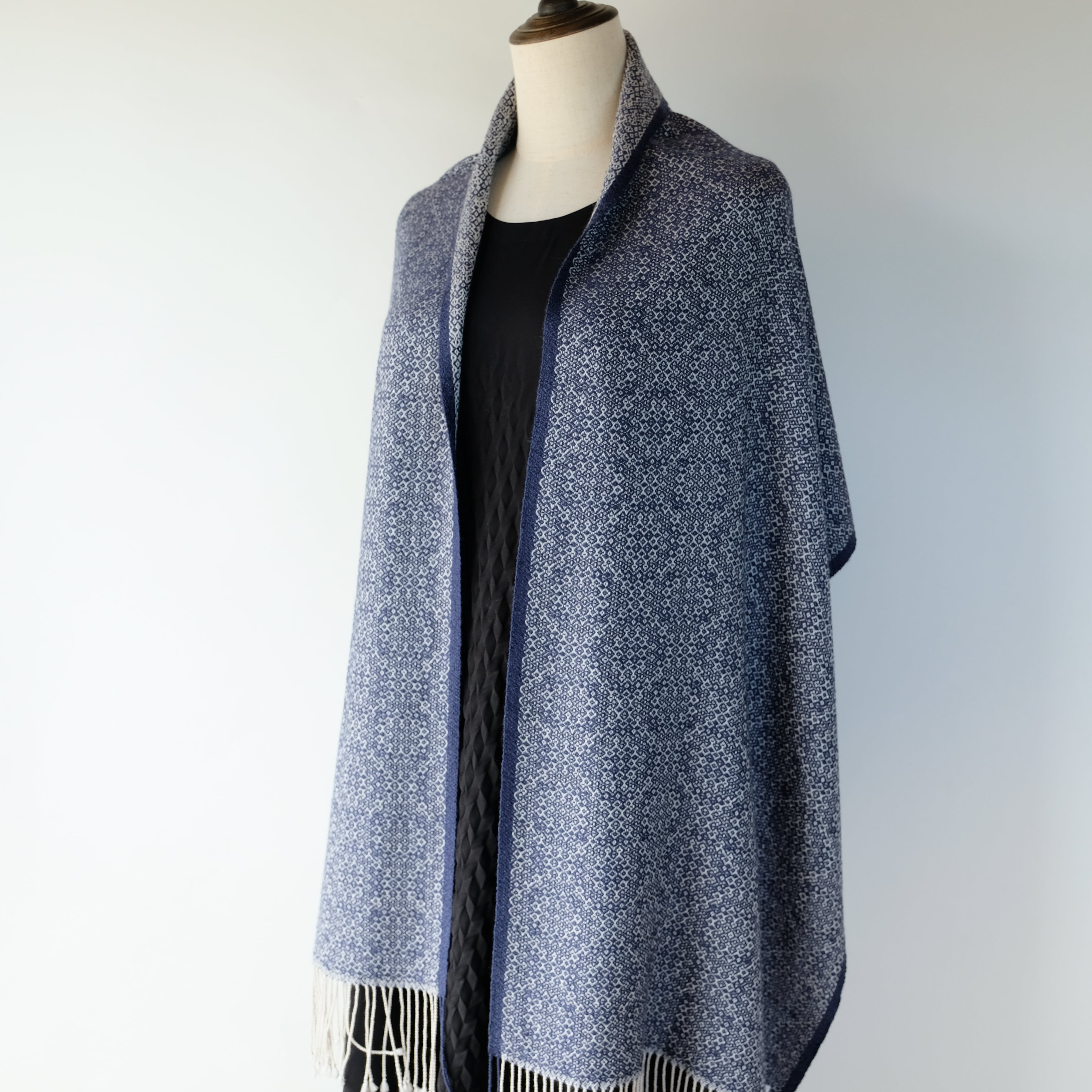 やわらかなアイボリーを経糸に、グレイッシュトーンのプルシアンブルーを緯糸に、細やかで複雑な柄を織り出しました。日本の伝統色では深縹色に近いとても綺麗な色合いです。表と裏で織柄と色の出方が変わるので、纏い方でいろいろな表情を楽しんでいただけます。ふっくら柔らかくとても温かいので、春や秋はトップスやコートの代わりに、冬には首元に小さく巻いてマフラーのような纏い方がおすすめです。シルク混なので上品な光沢と華やかさがあり、フォーマルな場にもお使いいただけます。