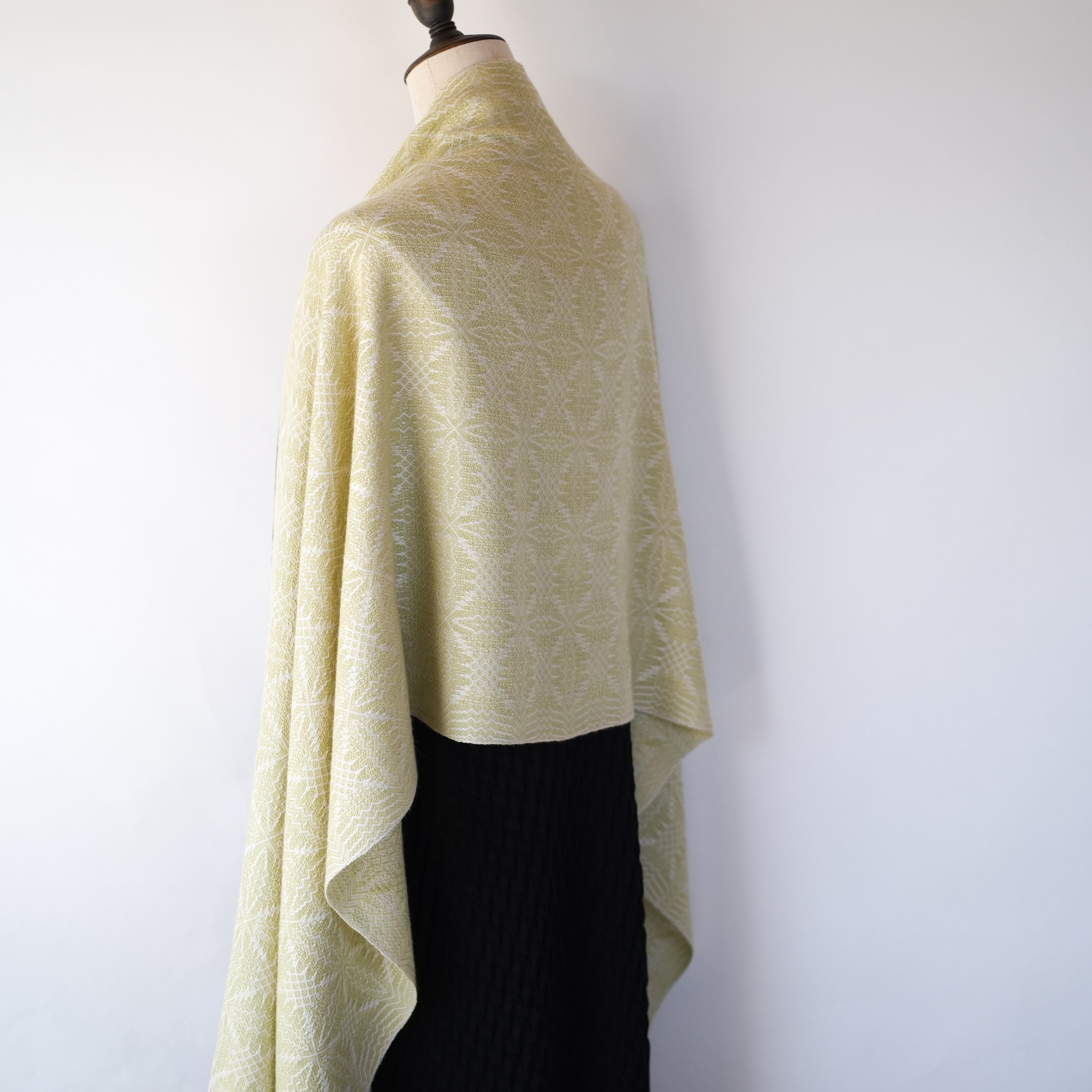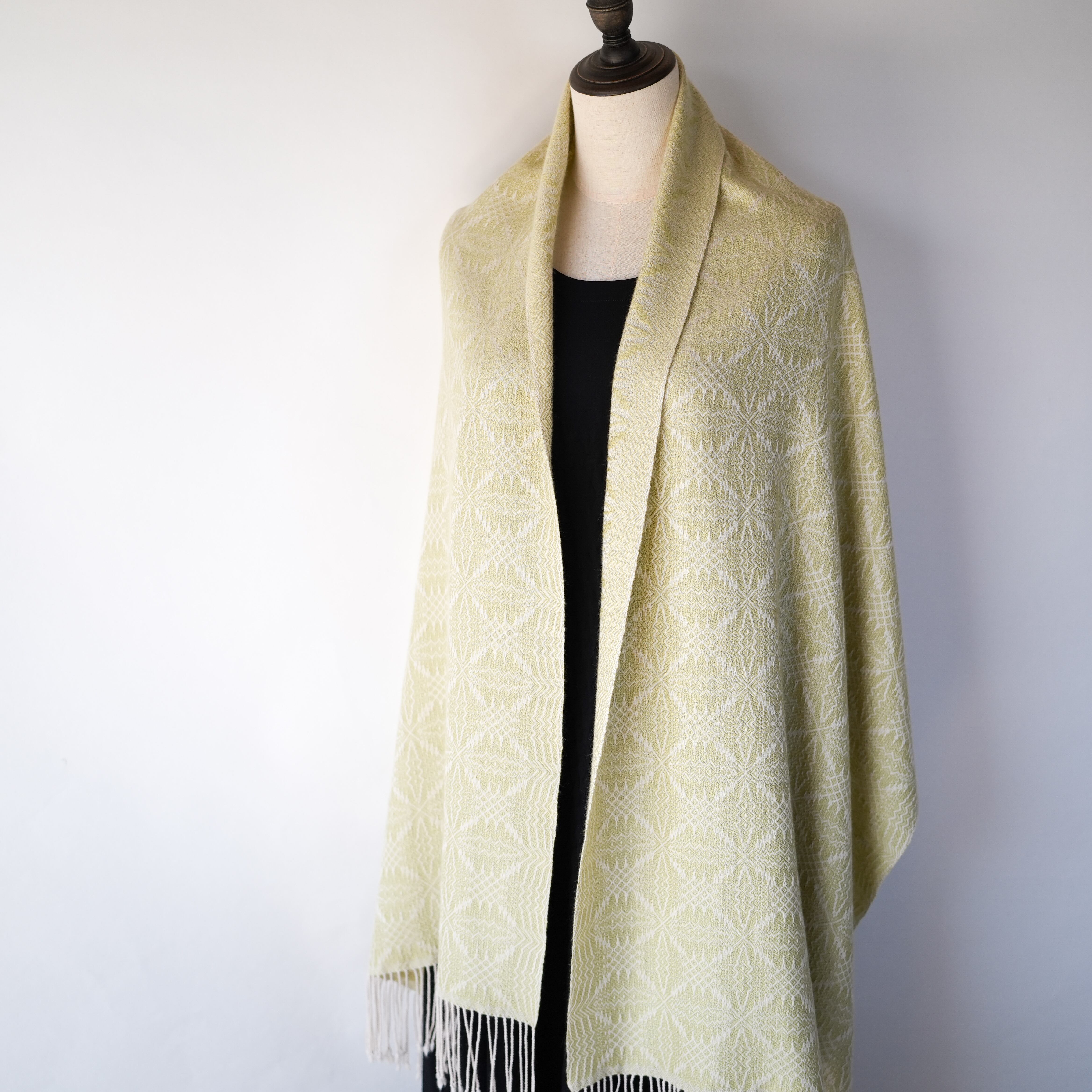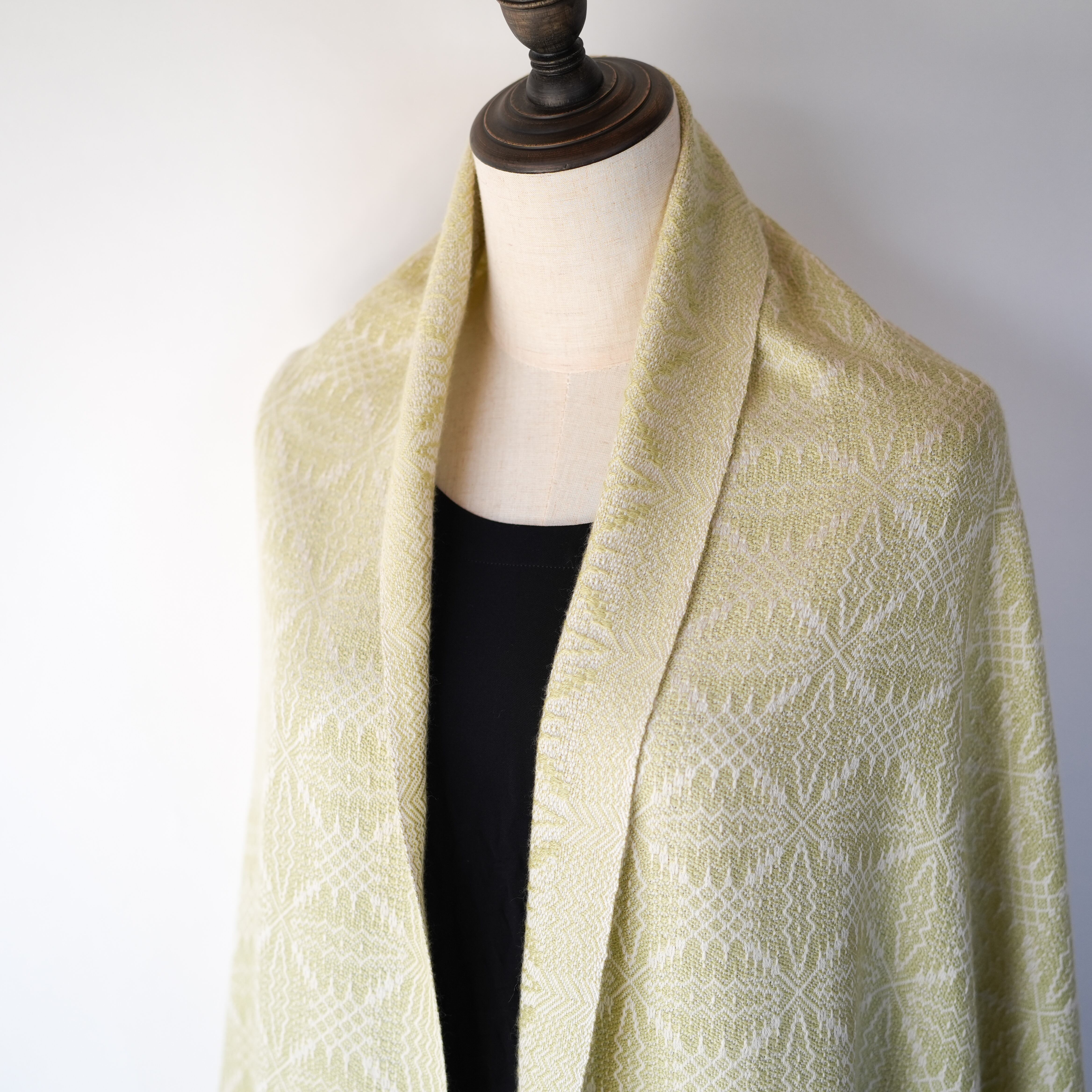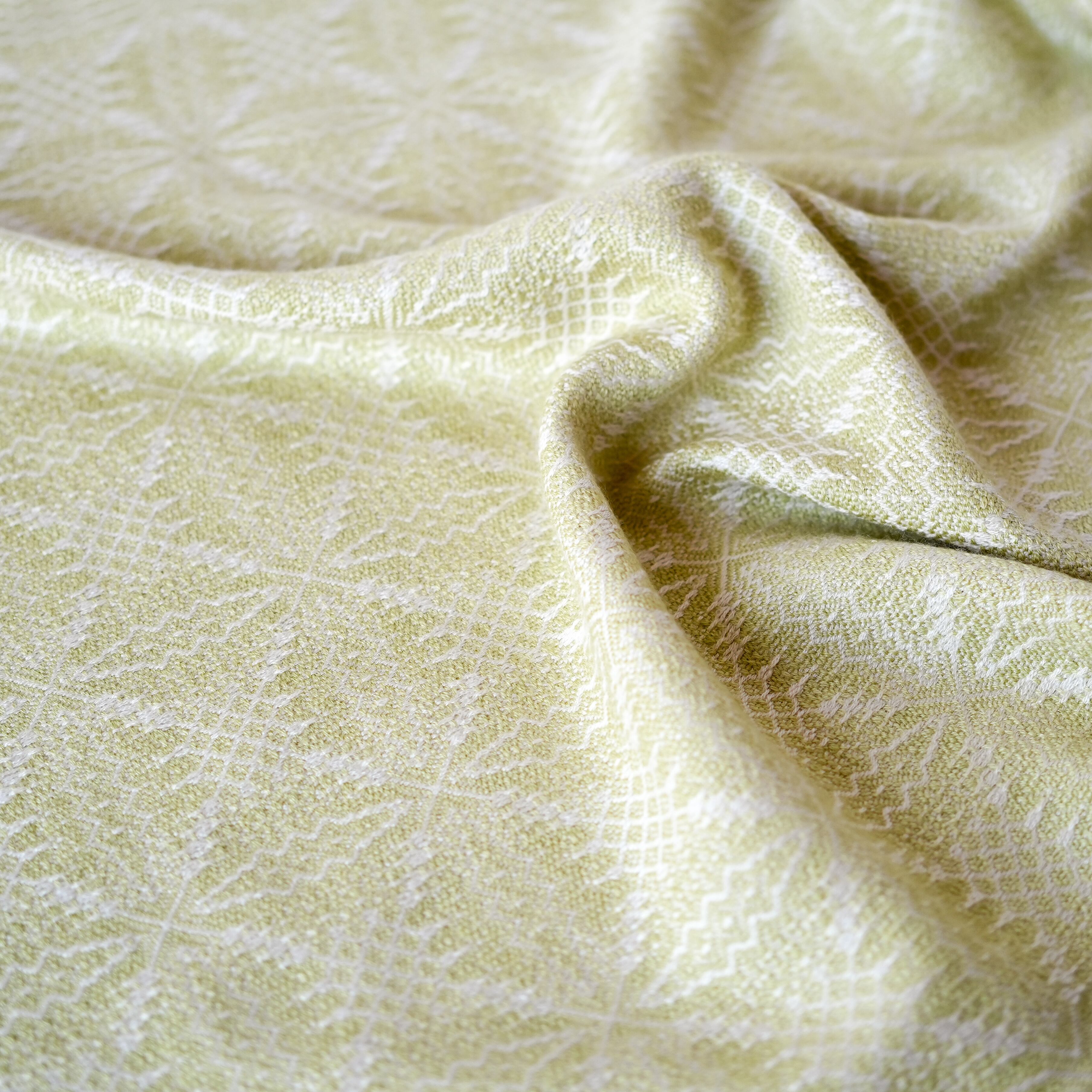 温かみのあるアイボリーをたて糸に、淡いトーンの黄色味のライトグリーン(若苗色)をよこ糸に、細やかで複雑な柄を織り出しました。たて糸とよこ糸の色相の差が少なく遠目では無地のようにも見えますが、光の反射の仕方で光沢感のある紋様がはっきりと浮かび上がり、控えめながらも華やかさのあるストールです。表と裏で織柄と色の出方が反転するので、纏い方でいろいろな表情を楽しめます。春や秋は広げてアウターの代わりに、冬は首元に小さく巻いてマフラーのように、また、上品な光沢があるのでフォーマルな場にもお使いいただけます。春に芽吹いた若草のような優しい色合いのライトグリーンで、シンプルで洗練された大人コーデのポイントにお勧めのストールです。