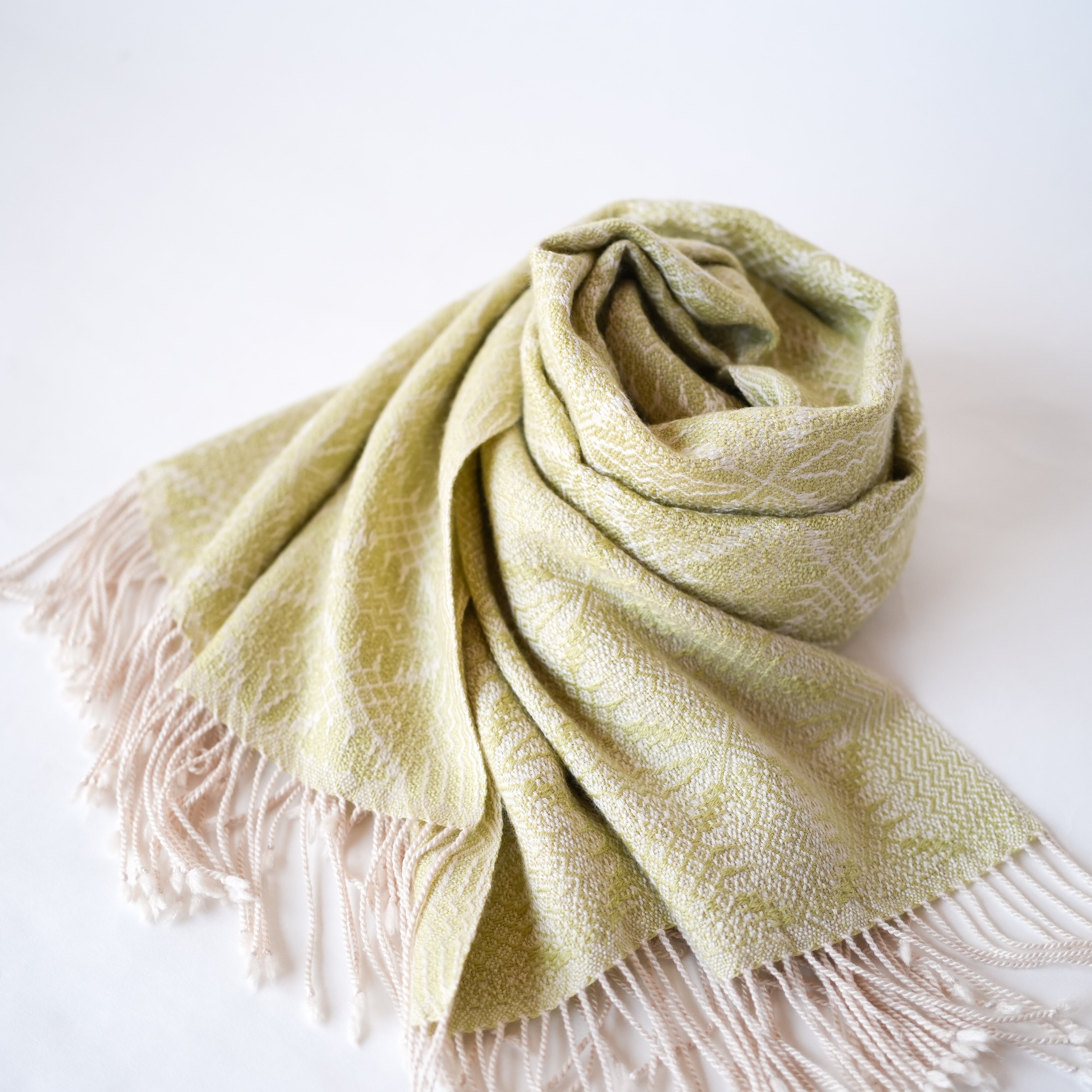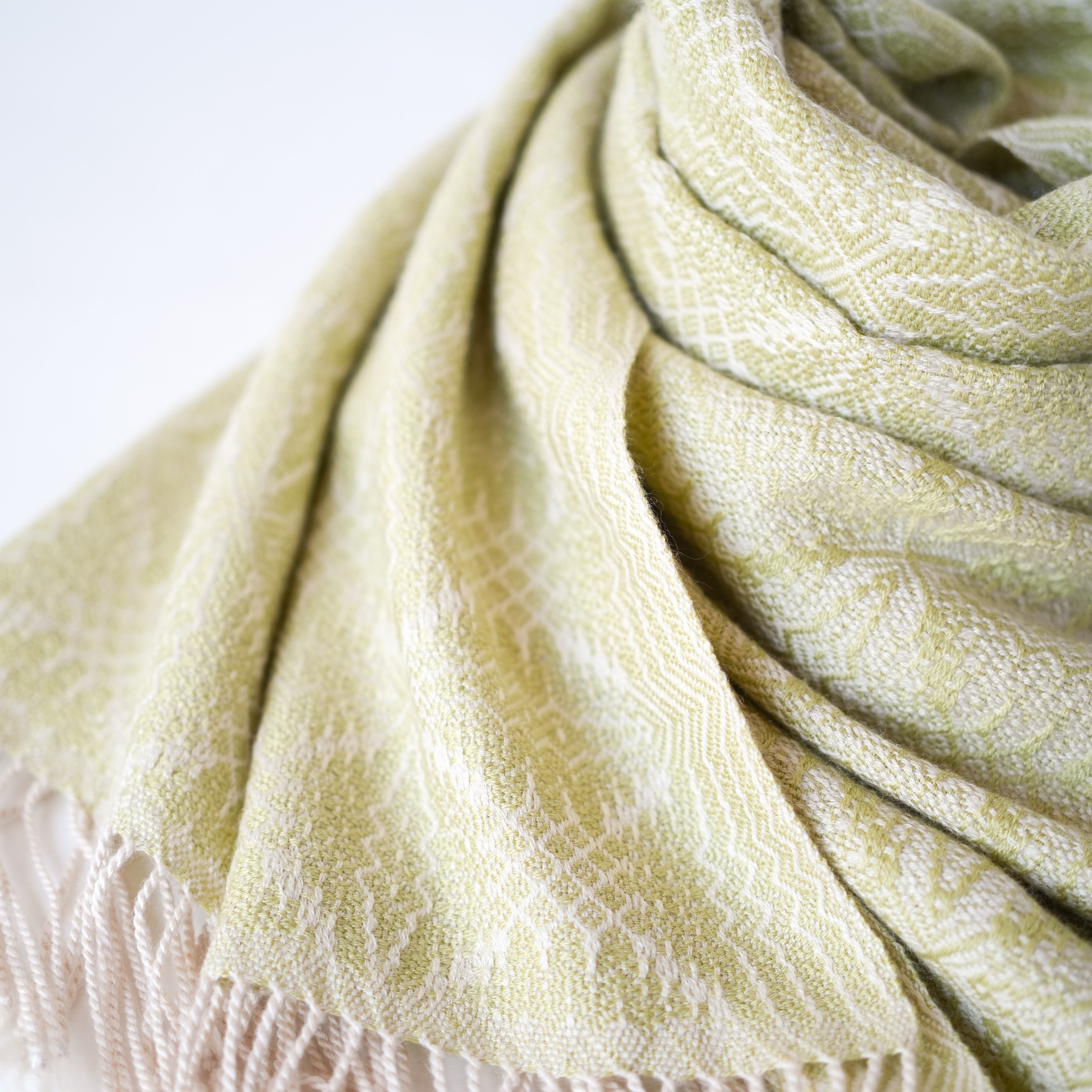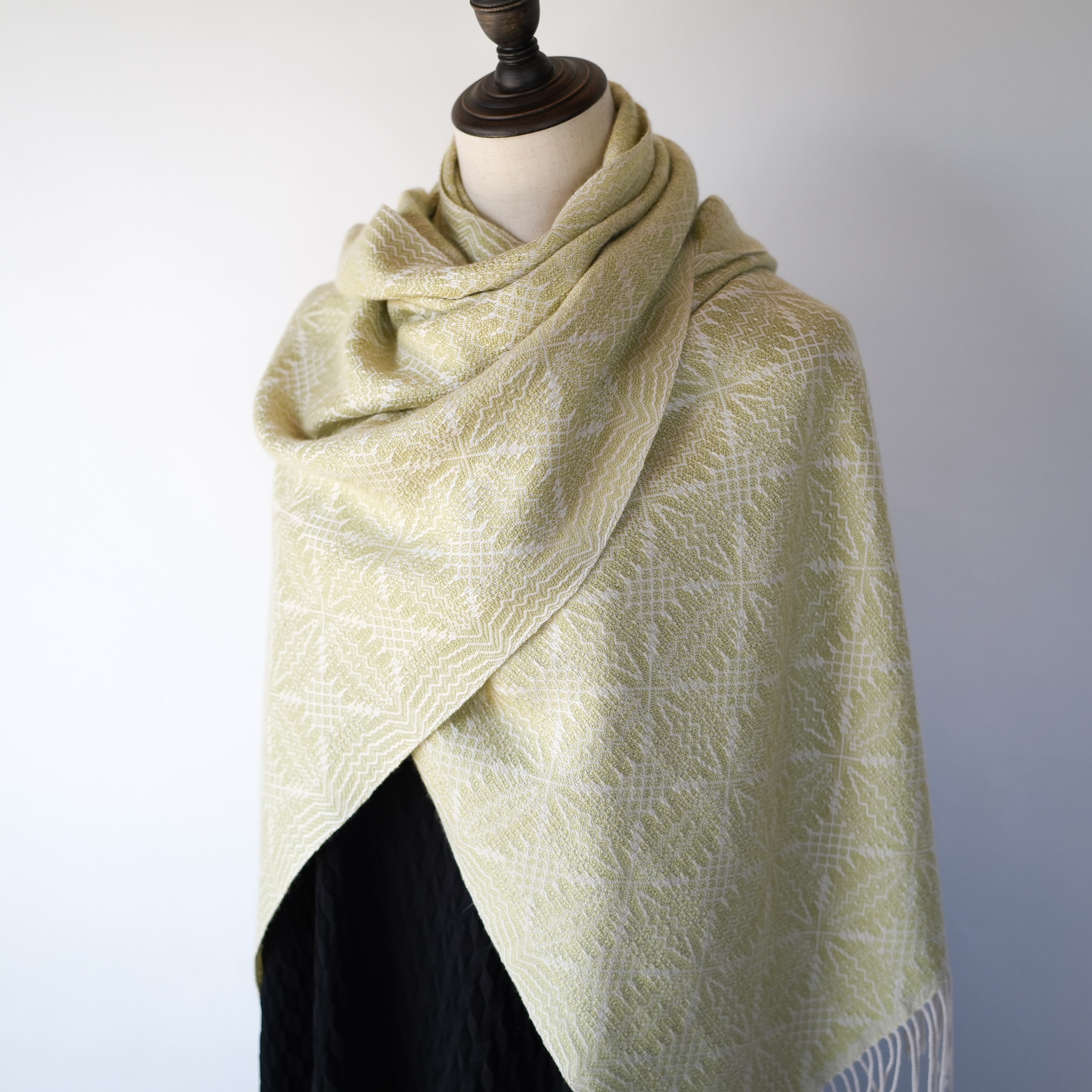 温かみのあるアイボリーをたて糸に、淡いトーンの黄色味のライトグリーン(若苗色)をよこ糸に、細やかで複雑な柄を織り出しました。たて糸とよこ糸の色相の差が少なく遠目では無地のようにも見えますが、光の反射の仕方で光沢感のある紋様がはっきりと浮かび上がり、控えめながらも華やかさのあるストールです。表と裏で織柄と色の出方が反転するので、纏い方でいろいろな表情を楽しめます。春や秋は広げてアウターの代わりに、冬は首元に小さく巻いてマフラーのように、また、上品な光沢があるのでフォーマルな場にもお使いいただけます。春に芽吹いた若草のような優しい色合いのライトグリーンで、シンプルで洗練された大人コーデのポイントにお勧めのストールです。