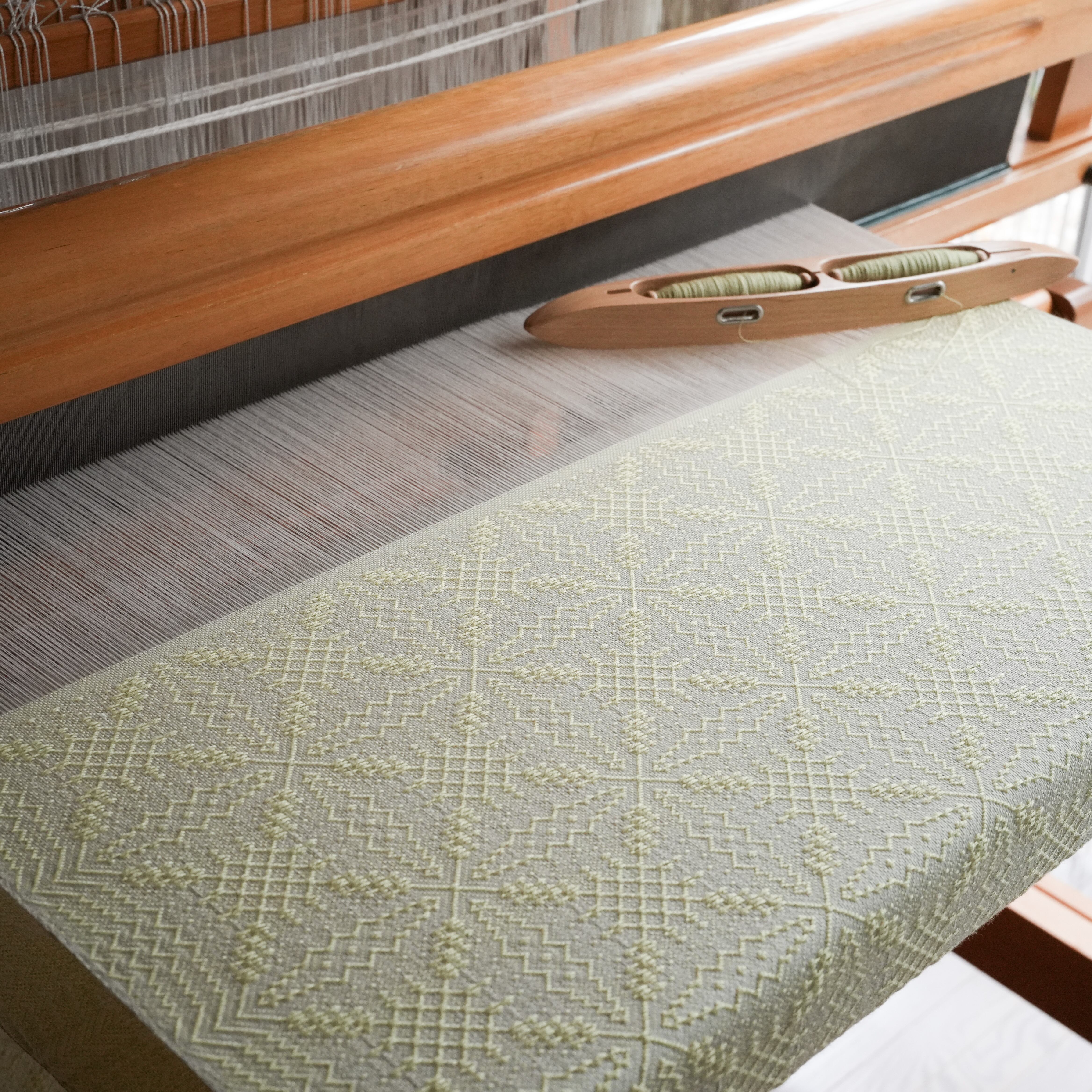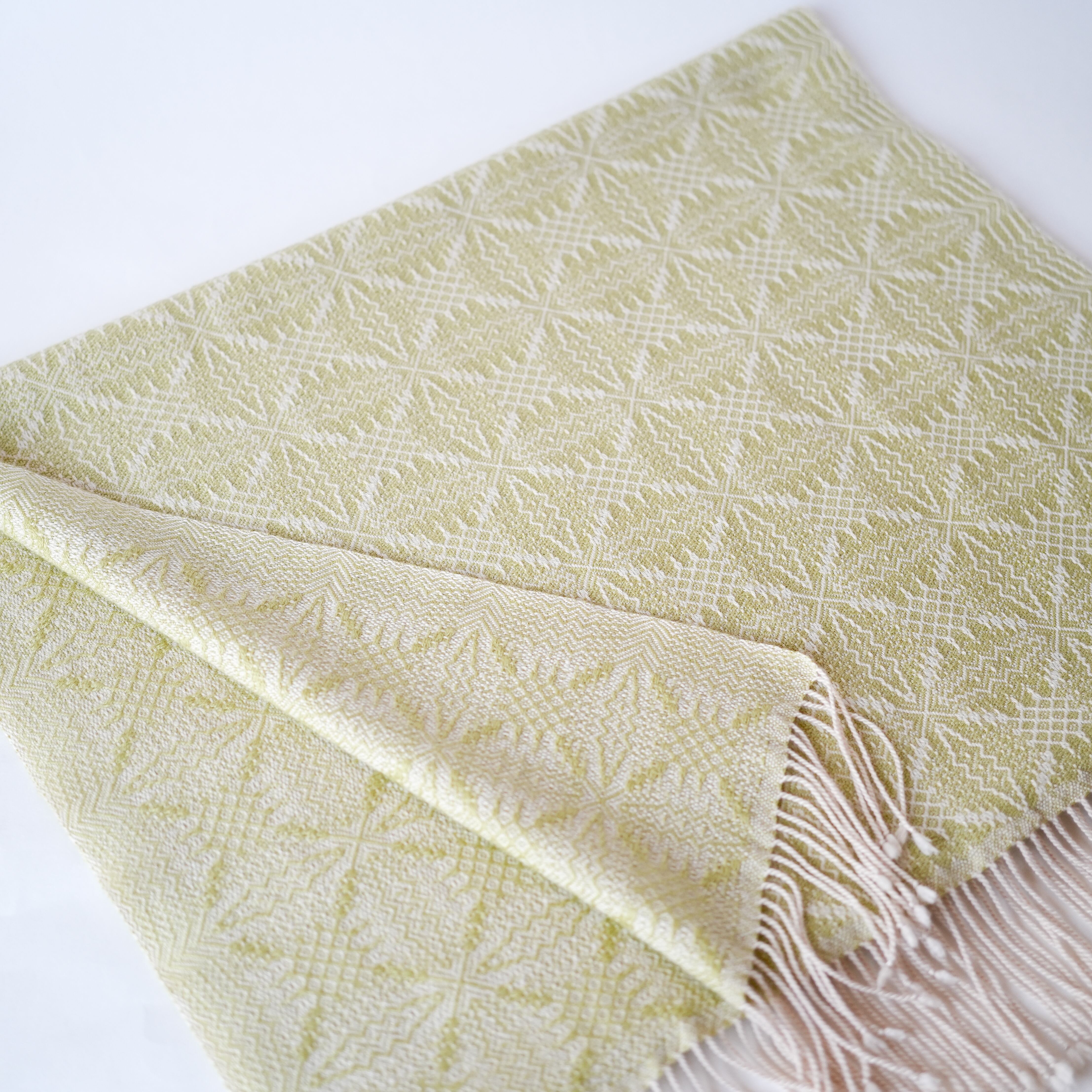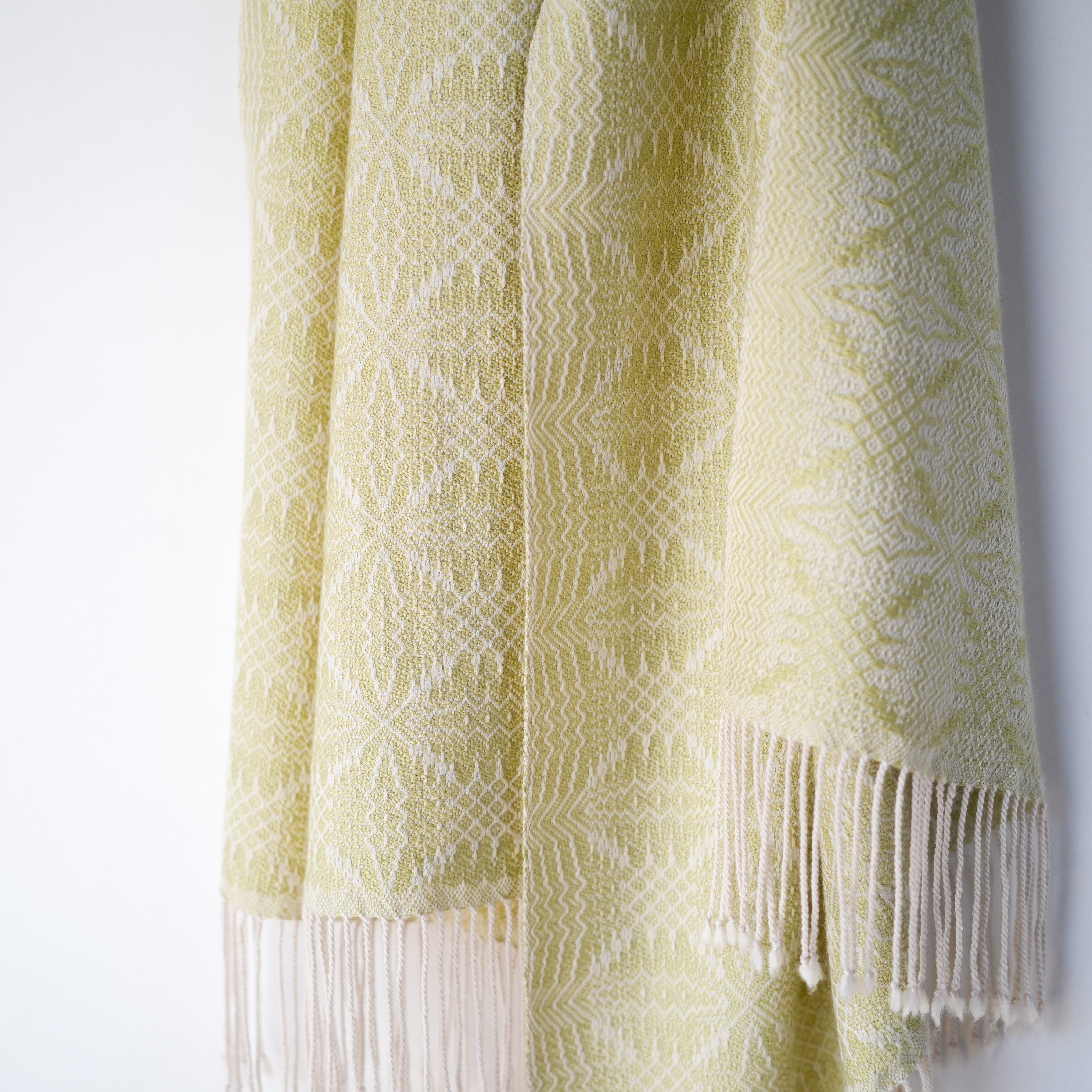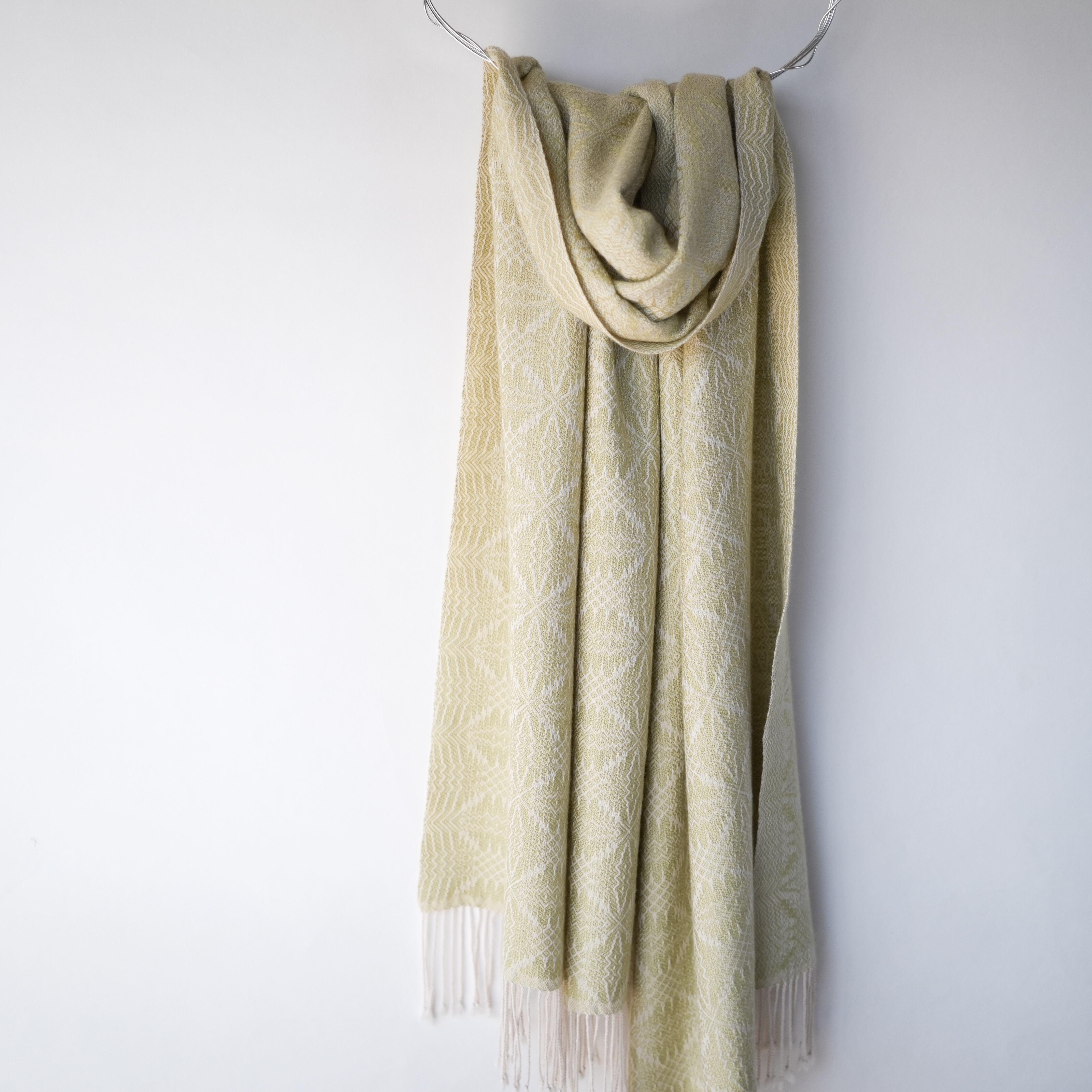 温かみのあるアイボリーをたて糸に、淡いトーンの黄色味のライトグリーン(若苗色)をよこ糸に、細やかで複雑な柄を織り出しました。たて糸とよこ糸の色相の差が少なく遠目では無地のようにも見えますが、光の反射の仕方で光沢感のある紋様がはっきりと浮かび上がり、控えめながらも華やかさのあるストールです。表と裏で織柄と色の出方が反転するので、纏い方でいろいろな表情を楽しめます。春や秋は広げてアウターの代わりに、冬は首元に小さく巻いてマフラーのように、また、上品な光沢があるのでフォーマルな場にもお使いいただけます。春に芽吹いた若草のような優しい色合いのライトグリーンで、シンプルで洗練された大人コーデのポイントにお勧めのストールです。